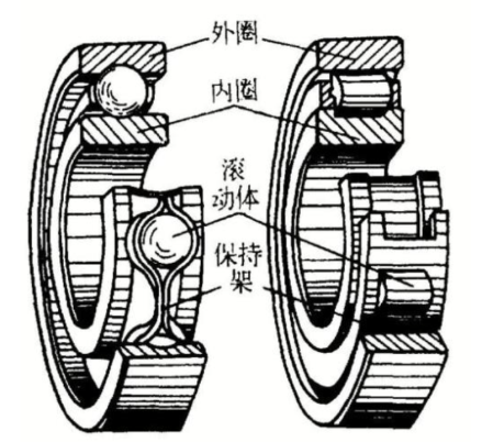 滚动轴承用来将电机运转时轴与轴之间的滑动摩擦转变为滚动摩擦,节省功率消耗,提高机械效率。滚动轴承电机工作可靠性高,可维修性好,同时有较好的启动性能和承载能力,但由于滚动体与轴的内外圈之间都是直接的刚性接触,所以减振能力较差,会产生较大的噪音。电机的振动情况几乎能够完全传递到轴承外壳上,故可在轴承外壳上采用接触式加速度传感器来测量振动信号。常见的滚动轴承结构如图2.6所示。