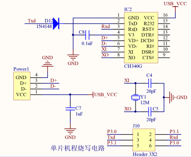 (3)接口转换电路是单片机与计算机进行通信的桥梁,这里选用CH340G为核心的转换电路,负责将单片机输出的TTL电平转换为USB串口信号,保证数据可以发送至计算机。