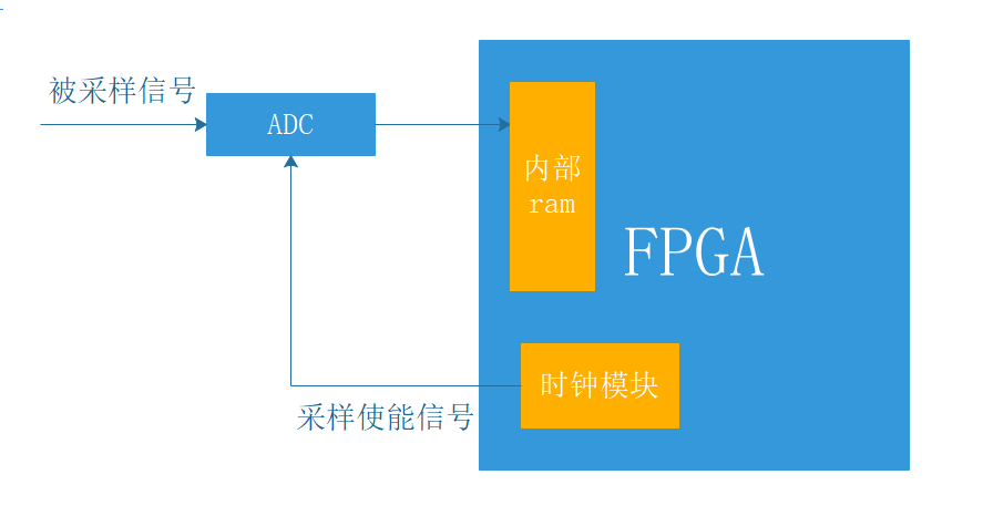 顺序采样结构图如图2.1所示。顺序采样中,当第一个上升沿跳变触发脉冲到来时,ADC对被采样信号进行采样,并将采样到的采集点存入到FPGA中。当ADC的第二个触发脉冲到来时,ADC对被采样信号进行采样,并同样的储存在FPGA中。以此类推,当ADC对被采样信号采集完信号上所有点后,用ADC采集的信号点可以重构出被采集信号[6, 8]。