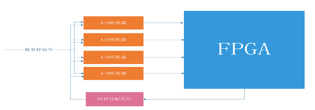 多ADC交错采样即是用多个ADC通过时钟芯片的控制的控制,使每个A/D转换器之间的相位角造成有90度的偏差。然后FPGA给每个A/D转换器轮流的发送一个采样信号进行采样。这种情况下,一个ADC在采样了之后,另一个ADC则可以在第一个ADC采样完成之后,通过FPGA控制的方波触发之后进行采样,这样一来,多个相同的采样频率的ADC就可以采样超过采样定理所规定的高频信号。如过,有四个采样频率为250M的采样信号,那么就可以在交错采样定理下采样频率可以达到1G。[9]