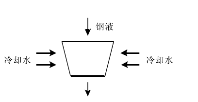 一直以来,人们通常都把结晶器当做是一个“特殊容器”加以区别对待,如下图1.1所示,沸腾的钢液经由上口灌入到结晶器的内腔中,而冷凝水则从结晶器的底部注入,经过一段时间的冷却后,铸坯的外壳就成型了。铸坯外壳的尺寸取决于结晶器的内腔的尺寸大小,结晶器的内腔尺寸需要根据成品的生产要求在浇铸之前就完成调整[10]。钢液在结晶器的内腔中经由冷却、凝固等一系列复杂的过程而形成铸坯外壳,这是一个异常复杂的结晶传热过程。如果这个过程中出现纰漏,可能会导致板坯的表面缺陷和内部缺陷。所以说,结晶器对于连铸设备来说起着至关重要的作用。只有做好结晶器锥度的测量和控制工作,才能有效地保证结晶器的调幅作业工作顺利进行。在选用结晶器的锥度时,既要考虑拉速,又要兼顾考虑钢铁的含碳量。在浇铸含碳量较高的钢铁时需要选择较大的锥度,如果此时选择的锥度过小,会导致铸造而成的钢铁产生偏离角纵裂的情况;如果选择的锥度过大,就会大大增加拉坯的阻力大小,同时还会加剧结晶器的磨损。一般情况下,在进行铸造的生产过程中,需要人工测量和调节结晶器的锥度。由此可见,做好结晶器的测量和调节工作,可以节省生产用到的人力和物力,有效地提高铸坯的生产质量,同时也有利于提高铸坯的生产产量[11]。