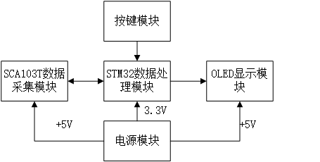 如下图2.1所示,系统共包括STM32数据处理模块、SCA103T倾角测量模块、OLED显示模块、独立按键模块和电源模块5个模块。
