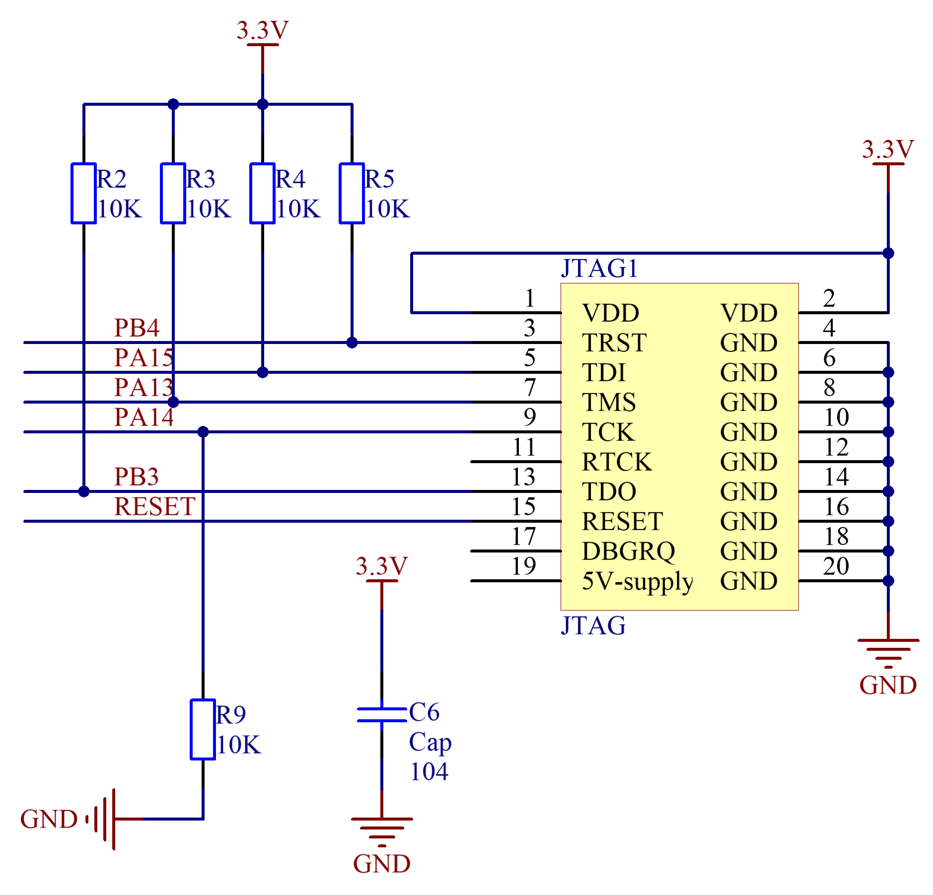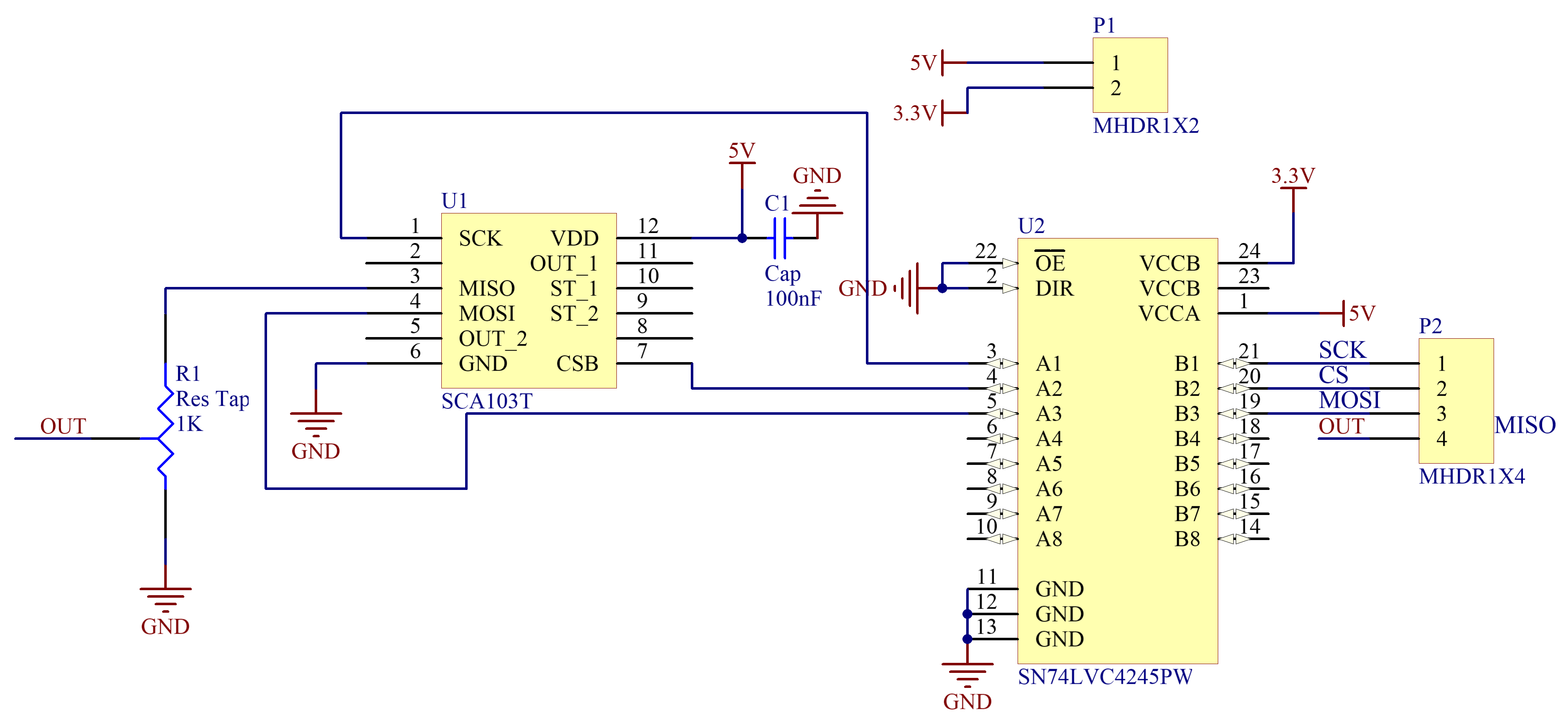 如下图3.1所示为SCA103T与STM32的接口电路图,SCA103T本身的电路比较简单,主要为与STM32进行通讯的接口电路,因为SCA103T是5V供电,STM3芯片是3.3V供电,所以使用LVC4245芯片作为电平转换电路,为了使用方便,将芯片方向控制地直接接地,使得主控芯片的控制信号可以直接通过LVC4245电平转换芯片传输给SCA103T传感器,而SCA103T传感器的输出数据则通过电阻分压后传回主控芯片。