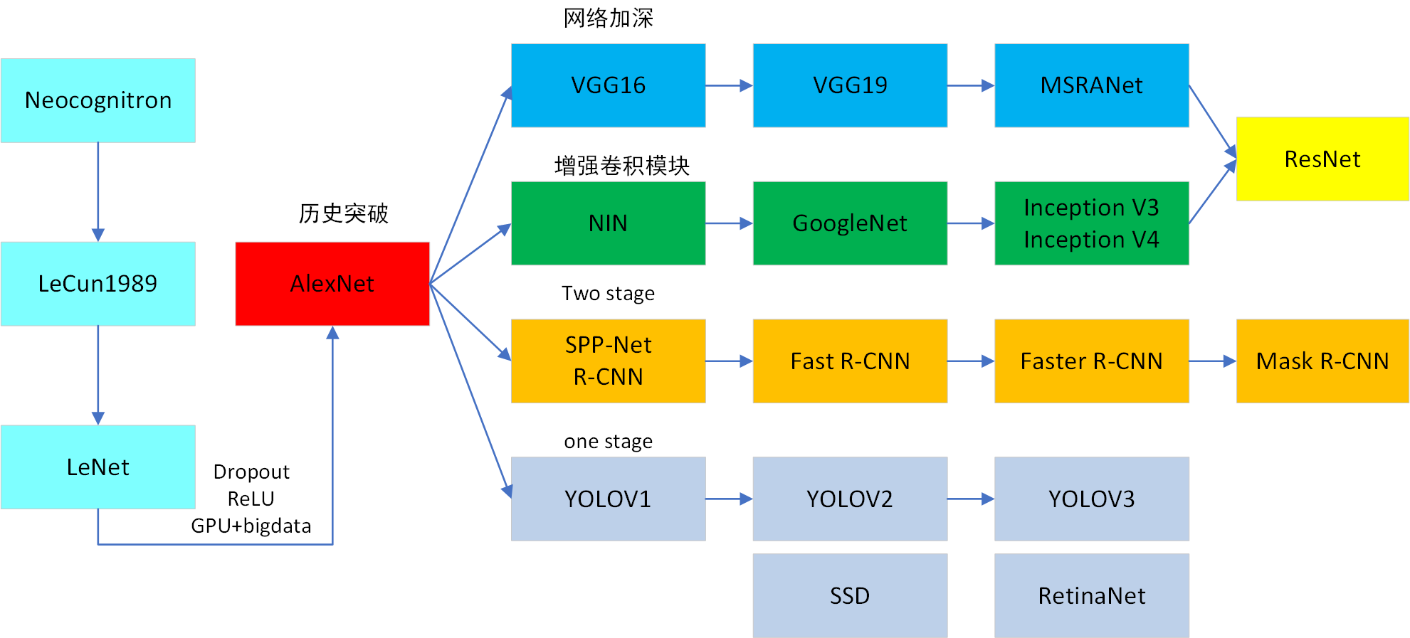 自2012年的AlexNet开始,各类卷积神经网络多次成为ImageNet大规模视觉识别竞赛(ImageNet Large Scale Visual Recognition Challenge, ILSVRC)的优胜算法,包括2013年的ZFNet、2014年的VGGNet、GoogLeNet和2015年的ResNet。近年来,深度卷积神经网络的目标检测算法表现越来越出色,检测精度和检测速度跨越式增长。逐渐发展成为两大分支,一是基于区域推荐(Region Proposal)的以R-CNN为代表的深度学习目标检测算法(R-CNN、SPP-NET、Fast R-CNN、Faster R-CNN和Mask R-CNN等),这种方法是分两步实现检测定位的;二是基于回归方法的以YOLO为代表的深度学习目标检测算法(YOLO、SSD等),这种方法是一步完成检测定位的。