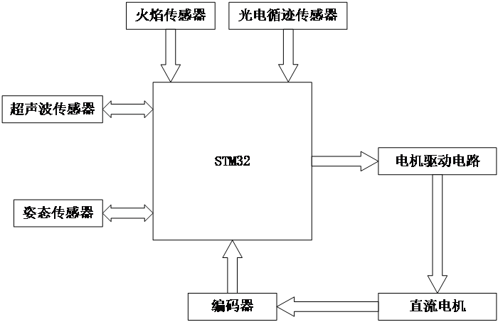 本设计中的智能灭火机器人采用的主控制器是STM32单片机。获取周围环境信息和自身姿态信息主要通过光电传感器、超声波传感器、姿态传感器等传感器实现。直流电机由PWM信号驱动,调节电机转速可以通过修改PWM信号的占空比来实现。其系统组成框图如图2.1所示。
