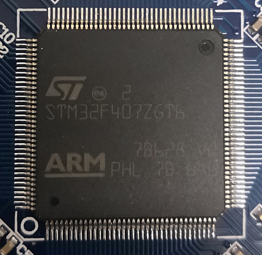 本设计中的智能灭火机器人采用的控制器是基于ARM Cortex M4F处理器内核的STM32F4系列单片机,单片机实物如图2.2所示。该单片机最小系统简单,提供多达144个引脚,具有1MB闪存,能够连接丰富的外设,具有多达15个通信接口,便于接收传感器的数据[5]。其内部封装仅为10*10mm,最小系统板体积较小,在设计灭火机器人底盘的结构的同时能够节约出更多的空间,便于传感器的安装。同时STM32系列单片机具有丰富的软件包支持,在MDK开发环境下可以通过调用库函数来实现较复杂的功能,一定程度上降低了编程难度,提高了编程效率。