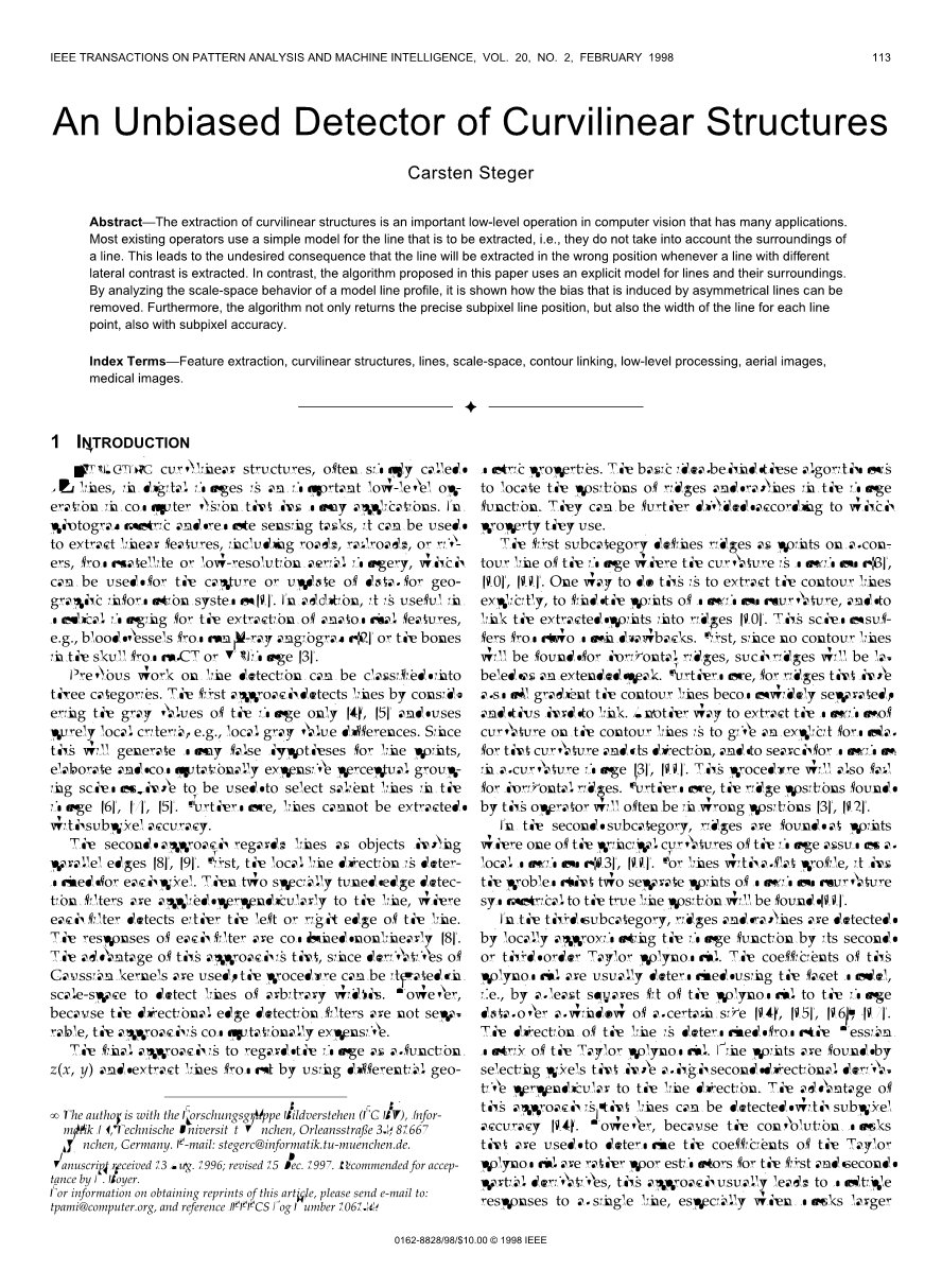 摘要:-曲线结构提取是计算机视觉中一项重要的底层操作,具有广泛的应用前景。大多数现有的方法仅仅对要提取的曲线使用了一个简单的模型,即,它们不考虑曲线的周围环境。这就导致了一个不理想的结果,即每当提取具有不同横向对比度的曲线时,都会在错误的位置提取曲线。相比之下,本文提出的算法对曲线及其周围环境使用了显式模型。通过分析模型线廓线的尺度空间行为,说明了如何消除由非对称线引起的偏差。此外,该算法不仅返回精确的亚像素线位置,还返回每个线点的线宽,具有亚像素精度。