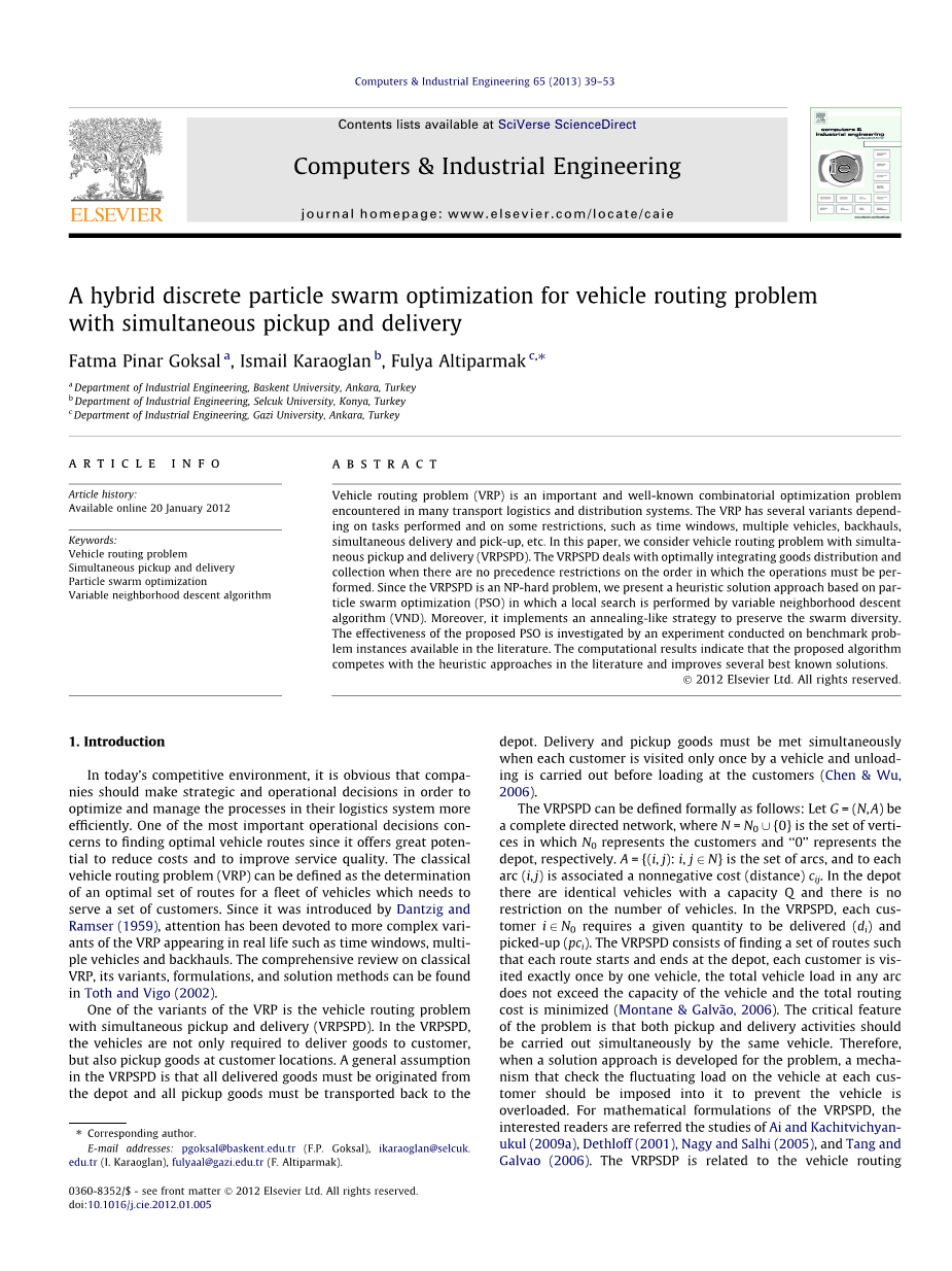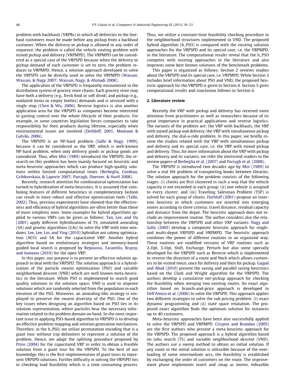 本文组织如下:第2节对VRPSPD及其特殊案例VRPMPD的研究进行综述。第3节包含了关于PSO和VND的简要信息,第4节给出了针对VRPSPD的启发式方法。第5节给出计算结果,结论仿放在第6节。