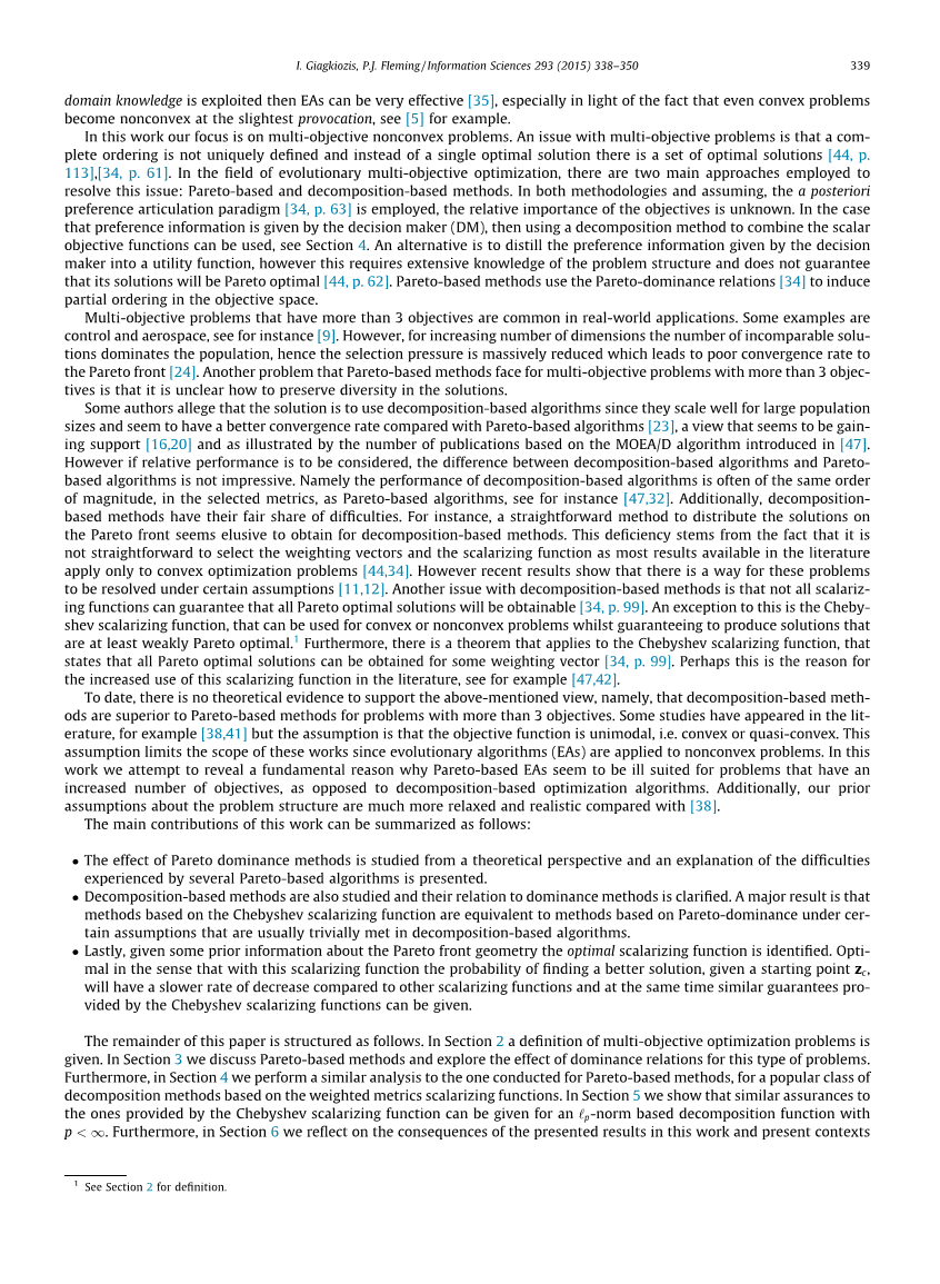 本文的其余部分结构如下。第2节给出了多目标优化问题的定义。在第3节中,我们讨论了基于Pareto的方法,并探讨了优势关系对这类问题的影响。此外,在第4节中,我们对一类基于加权度量标量函数的分解方法进行了与基于Pareto的方法相似的分析。在第5节中,我们证明对于满足p lt;infin;的基于norm的分解函数,可以给出与切比雪夫标量函数提供的类似的保证。此外,在第6节中,我们反思了所提出结果在这项工作中的后果以及目前的背景,在这些背景下,我们的结果可以建设性地用于改进解决大量目标问题的算法。最后在第7节中对这项工作进行了总结和总结。