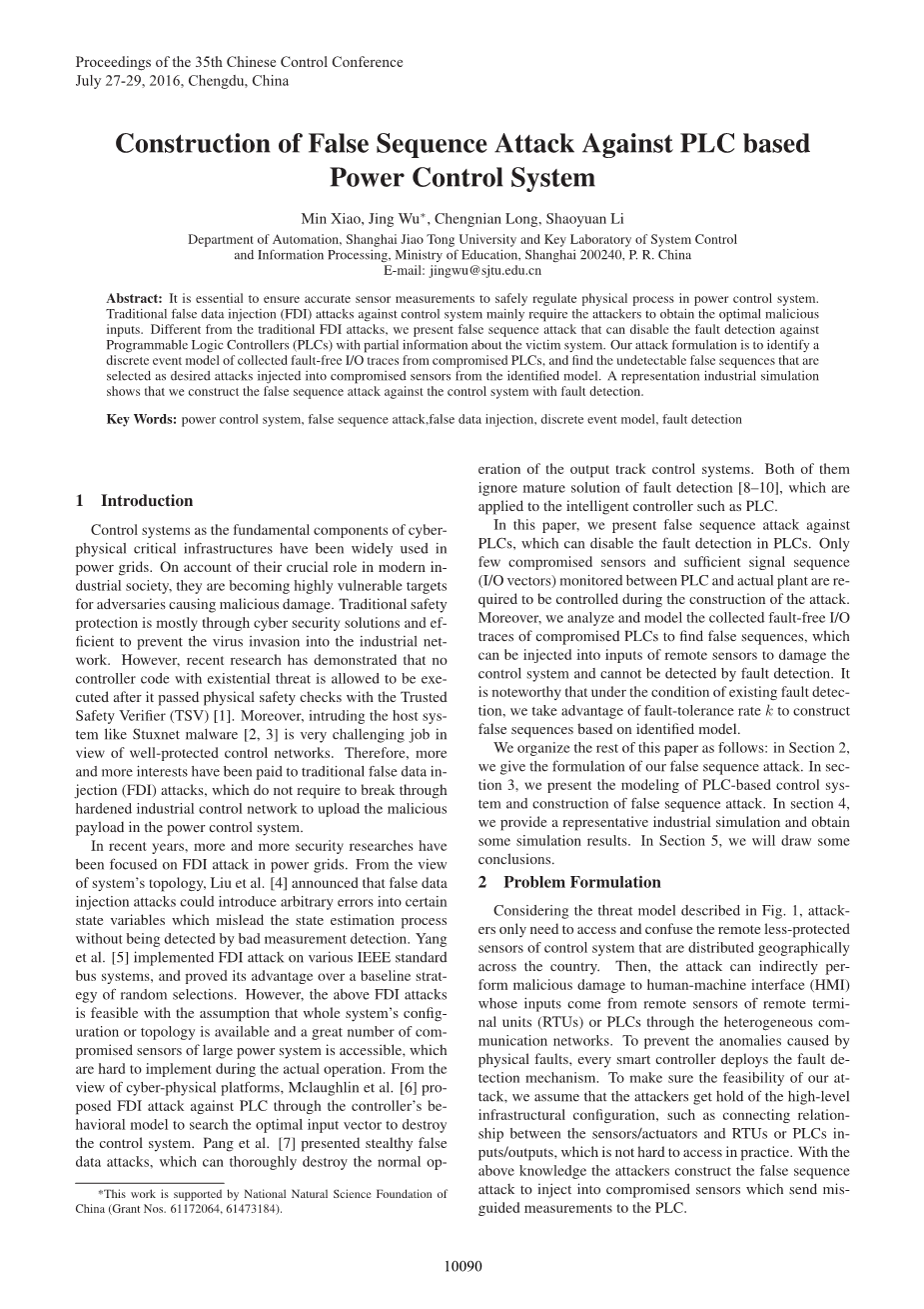 近年来,越来越多的安全研究集中在电网的FDI攻击。从系统拓扑的角度看,Liu et al。 [4]宣布虚假数据注入攻击可以引入任意错误到某些状态变量,误导状态估计过程,而不被错误的测量检测。 Yang et al。 [5]实施了对各种IEEE标准总线系统的FDI攻击,并证明了其优于随机选择的基线策略的优点。然而,上述FDI攻击是可行的,假设整个系统的配置或拓扑可用,并且可访问大量电力系统的大量受损的传感器,这在实际操作期间难以实现。从网络物理平台的角度来看,Mclaughlin et al。 [6]通过控制器的行为模型提出对PLC的FDI攻击,以搜索最优输入向量来破坏控制系统。 Pang et al。 [7]提出隐身假数据攻击,可彻底破坏输出跟踪控制系统的正常运行。两者都忽略了故障检测的成熟解[8] - [9] [10],它们被应用于智能控制器如PLC。