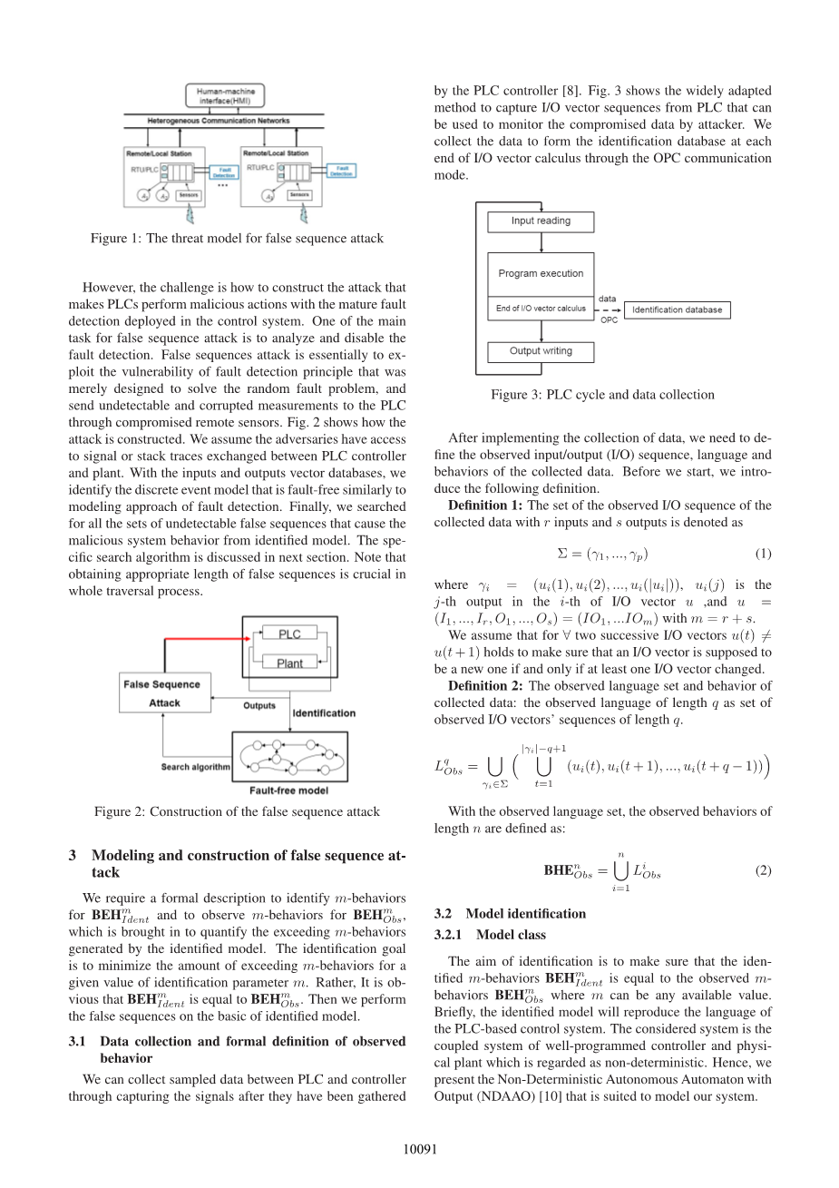 在本文中,我们提出对PLC的假序列攻击,这可以禁用PLC中的故障检测。 在攻击构造期间,仅需要控制在PLC和实际设备之间监视的几个受损传感器和足够的信号序列(I / O向量)。 此外,我们分析和建模受损PLC的收集到的无故障I / O轨迹,以发现假序列,这些错误序列可以注入到远程传感器的输入中,从而损坏控制系统,并且不能通过故障检测来检测。 值得注意的是,在现有故障检测的条件下,我们利用容错率k构建基于识别模型的假序列。