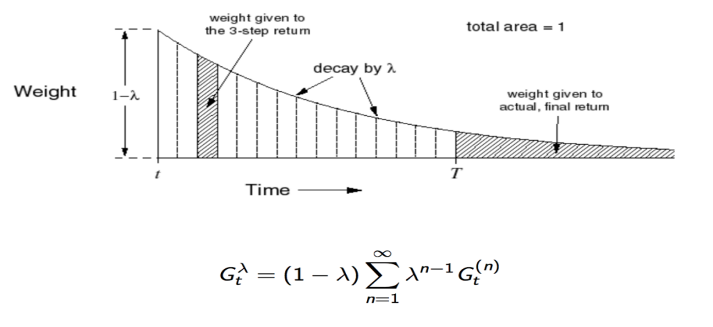 上面完成了对TD(0)的估计方式,接下来有三步可以拓展到n-step。 1)即TD-target再根据bellman方程展开;2)把TD(i)和TD(j)合在一起求平均;3)下面把能算的TD(i)都算一遍,每一个给个系数,总和为1,这就是TD(λ)。