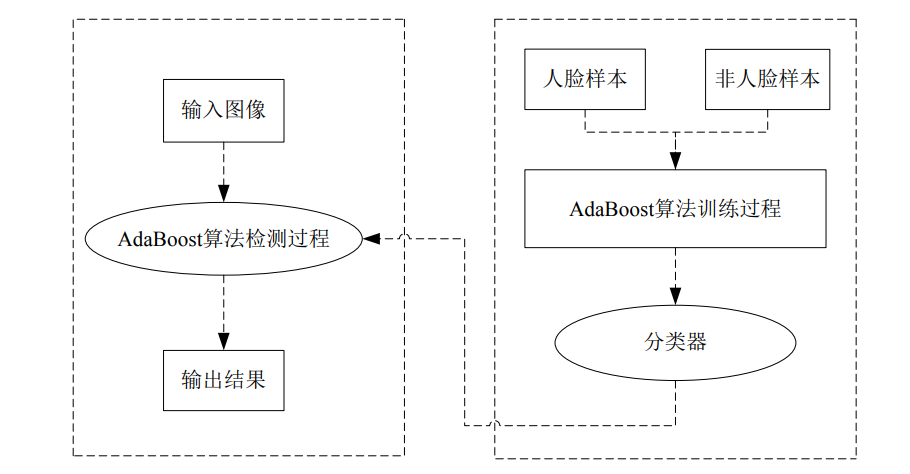 - 基于AdaBoost算法的人脸检测的方法[12]。基于AdaBoost算法的人脸检测一般应用Haar矩形特征来描述人脸面部的灰度分布特征,Haar矩形特征具有结构简单、提取速度快、计算方便等的优点。下图2.1描述了使用AdaBoost算法进行人脸检测时的整个流程。