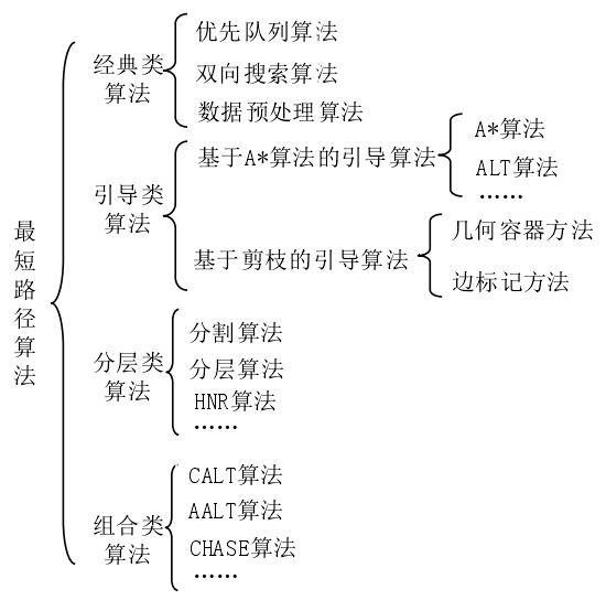 现有的最短路径规划问题可根据固定点个数大致分为两定点之间路径规划问题、单定点路径规划问题、多对多最短路径规划和全标记点最短路径规划问题[4]。两定点之间最短路径规划是当前最为热门的研究分支之一,根据不同的搜索查询策略[5],大致可以分为经典类、引导类、分层类和组合类几种[6],如图1.3所示。
