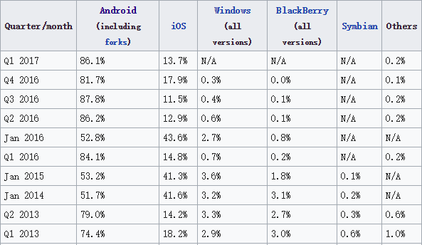 图2.1列出了近几年各种操作系统手机的销量情况,在2017年第一季度,采用Android 系统智能的手机销量占比达到了86.1%,这一比率在2016年第三、四季度也分别达到了惊人的87.8%和81.7%,这说明Android是移动设备操作系统的主流选择方案。