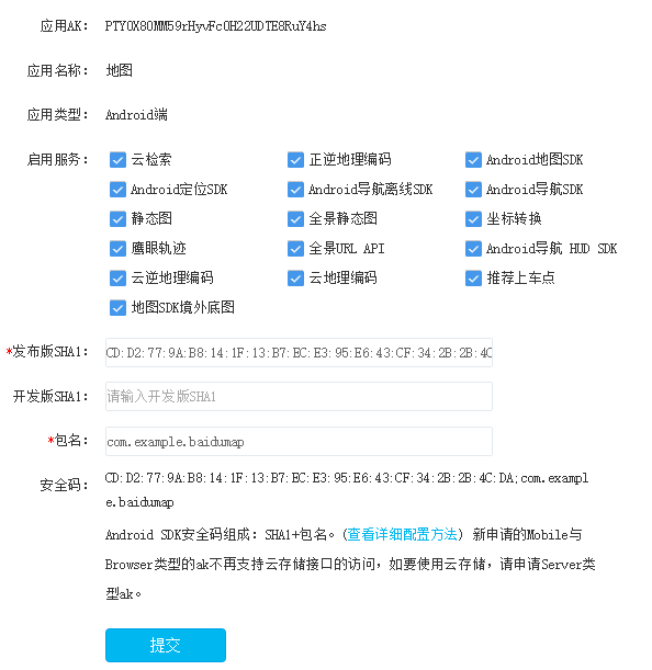 百度地图提供有基本地图调用显示、路径规划、LBS云存储和检索等功能,百度地图通过GPS、Wifi或者基站提供定位服务。创建一个Android客户端的应用需要申请如图2.3所示的百度地图API Key。