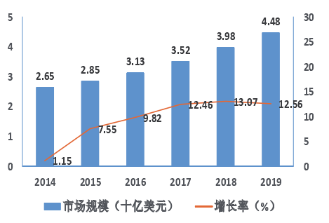 图1.1展示了中国手机地图市场用户规模的发展趋势,截止2017年6月,我国手机端电子地图用户累计规模达到了惊人的6.86亿人且还在不断增长。图1.2展示了全球范围内电子地图2014-2019年的市场规模趋势,预计2019年末,全球移动端电子地图市场规模将增长至44.8亿美元,年均复合增长率为11.07%[1]