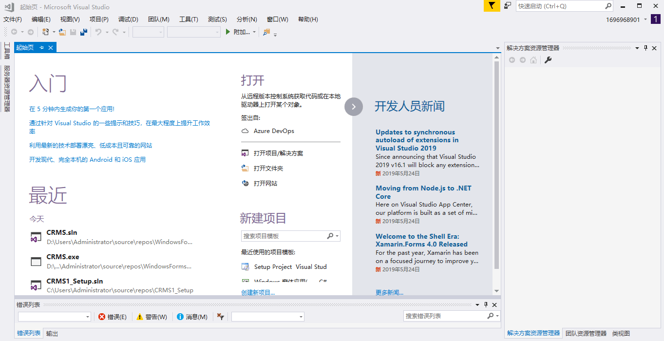 本毕业设计用到的VS 开发平台的版本是VS 2017,VS 2017是微软于2017年3月8日正式推出的新版本,是迄今为止最具生产力的VS 版本。VS 2017主界面如图2.1所示。