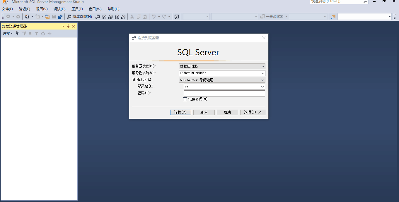 运行SQL Server 2017软件平台时,首先需要连接到数据器,选择好服务器类型、服务器名称、身份验证。当身份验证选择SQL Server身份验证时,输入设置好的用户名和密码后即可连接到服务器,进入相应服务器的数据库主界页。SQL Server 2017初始界面如图2.2所示。