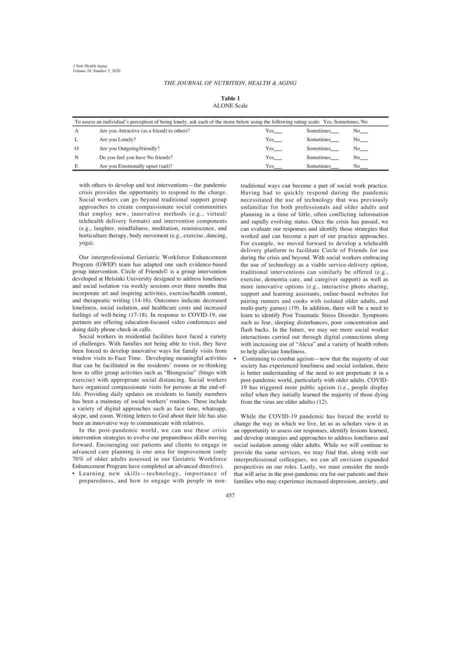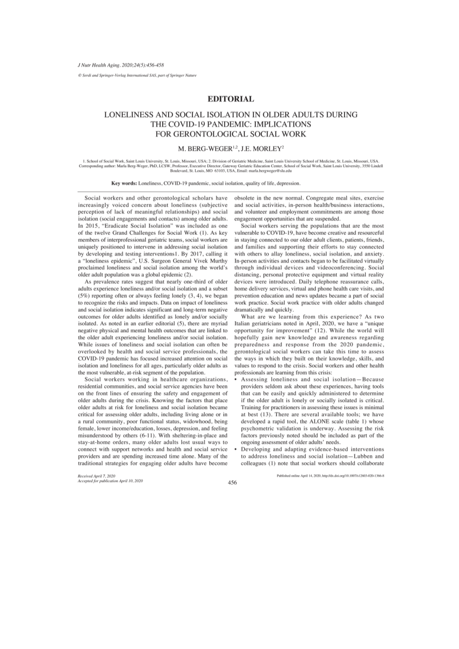 5. Berg-Weger M, Morley JE. Loneliness in older age: An unaddressed health problem. J Nutr Health Aging. 2020; 24(3): 243-245.
