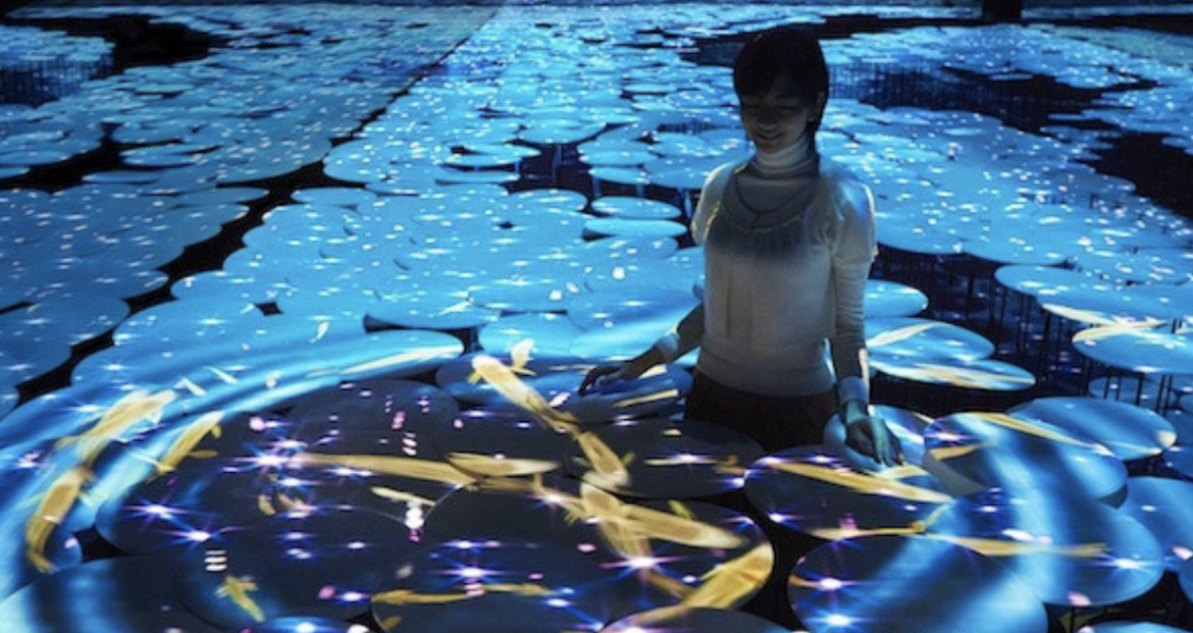 互动装置艺术与其他艺术的最大区别在于作品具有空间互动的特点,而其他类型的艺术大多直接表现在二维空间中。互动设备的另一大区别是其材料的全面性。它们通过计算机硬件和软件程序平台、自动化和其他技术,结合计算机输入和输出设备以及一些表现形式来展示艺术。日本团体实验室teamLab曾经在2015届的米兰世博会上展出互动装置艺术作品《HARMONY》,地上竖立着大量的荷花状装置,紧紧地簇在一起,折叠在一起,而荷叶表面的投影则是波光粼粼的水面,还有一大群锦鲤在空中游动。当观众耳朵里伴随着虫鸣和蛙声缓缓进入场地,会觉得自己像是在夏夜的池塘和田野里,站在里面,静静感受大自然想要表达的东西。