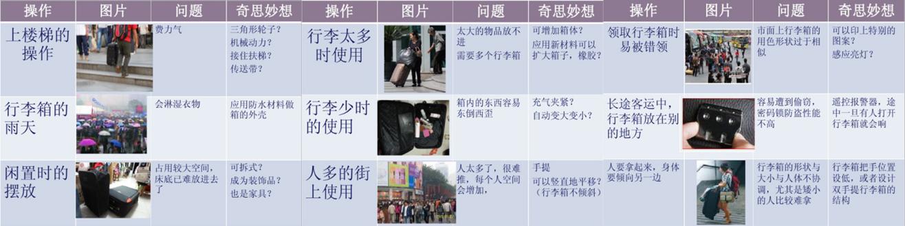 如图2.1所示,用户在使用行李箱的过程中发现了一系列的问题,这些问题影响了用户的使用体验。主要问题有:行李箱在上楼梯时不方便提拉;下雨天的时候雨水会透过行李箱淋湿衣物;行李箱在闲置时无处摆放;当行李太多时行李箱装不下过多的物品;当行李太少时使用过大的行李箱又会导致物品在行李箱内摇晃不止;在机场或汽车站等场所容易将行李箱认领错误,一旦这样的事情发生财产安全就得不到保障;在长途客运站等地行李箱可能被偷盗;行李箱的形状与大小与人体不协调,尤其是矮小的人不容易提拿。