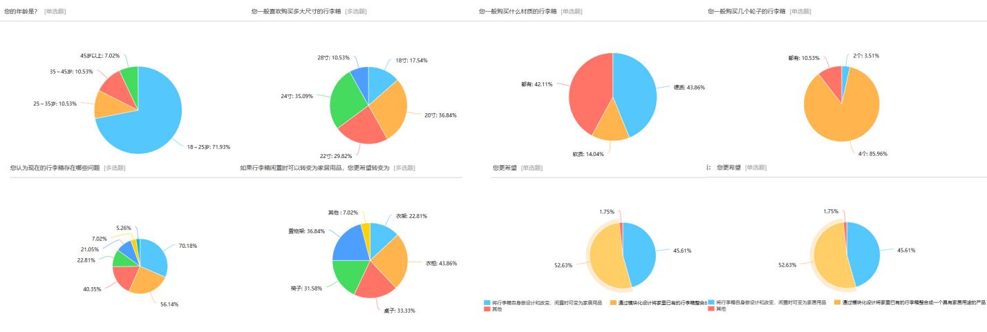 通过调查问卷的研究方式,最直接的了解了用户的需求,我也对用户需求进行了访问与总结。如图2.2所示,调查问卷主要设置的问题有:年龄、职业、年薪、平时使用的行李箱尺寸、材质、颜色、行李箱的拉杆方式、行李箱闲置时会摆放在那里、认为行李箱现存的问题有哪些、认为将行李箱转变为什么家居会比较好、更希望通过什么样的方式来实现行李箱转变为家居产品的设计等等一系列问题,并且得到了很好的反馈。调研结果显示,60%的用户会选择20寸、22寸、24寸的行李箱,68%的家庭拥有2~3个行李箱,80%的用户会选择硬质材质的行李箱,85%的用户会选择购买四个轮子的行李箱,59%的用户会选择购买双杆式的行李箱,并且大多数用户的行李箱在闲置时会选择存放在衣柜顶上、床底下、家中角落等地方,在行李箱的现存问题上,大多数用户认为行李箱上楼梯时太过于沉重不方便提,还认为行李箱在不使用时太占据家中空间。