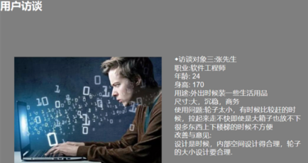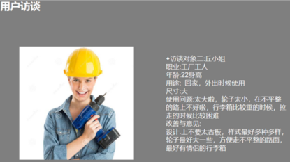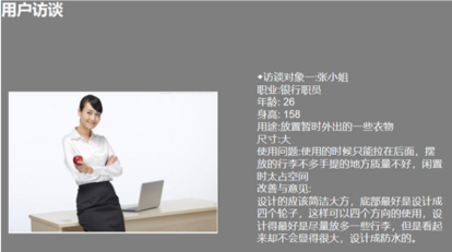 在进行调查问卷之后,我还对不同年龄段不同职业的人进行的访谈。如图2.3,访谈问题与问卷问题相似,主要包括年龄、职业、身高、用途、尺寸、使用问题、改善与意见等。访谈结果显示银行职员张小姐认为使用的时候只能拉在后面,摆放的行李不多手提的地方质量不好,闲置时太占空间,提出了设计的应该简洁大方,底部最好是设计成四个轮子,这样可以四个方向的使用,设计得最好是尽量放多一些行李,但是看起来却不会显得很大,设计成防水的的改善意见;工厂工人邱先生认为行李箱太大了,轮子太小,在不平整的路上不好啦,行李箱比较重的时候,拉走的时候比较困难,并且提出设计上不要太古板,样式最好多种多样,轮子最好大一些,方便走不平整的路面,最好有情侣的行李箱的改善意见;软件工程师张先生认为轮子太小,有时候比较赶的时候,拉起来走不快即使是大箱子也放不下很多东西上下楼梯的时候不方便,并且提出了内部空间要设计得合理,轮子的大小设计要合理的改善意见。