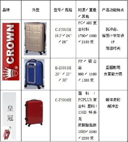如图2.4所示,各个品牌的行李箱都有其各自的特点,但是他们也都有一些共同的特点,比如行李箱的抗冲击能力都非常的好,行李箱的箱体都有很稳固的特点等等。但是材料的不同也带来了价格的差异,一些性能良好的行李箱价格都计较昂贵,除了功能和材质的原因,品牌也是影响价格的一个很重要的原因,品牌的等级区间也使行李箱的价格有了相匹配的空间。