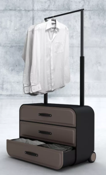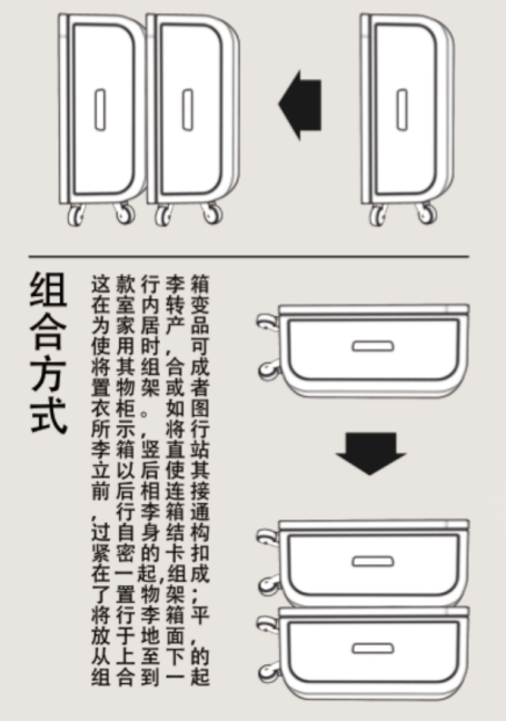 主要解决了行李箱闲置时占据家庭空间,并且利用率很低的问题。通过将行李箱设计为可以在闲置时转变为家居产品的设计,使行李箱不仅满足人们日常出行的需求,也可以在家充分发挥其功能作用,不至于将其闲置在家,充分利用行李箱本身的功能也充分合理的利用了家庭内部空间,使蜗居人群和住宅面积狭小的用户不再苦恼行李箱的存放问题。