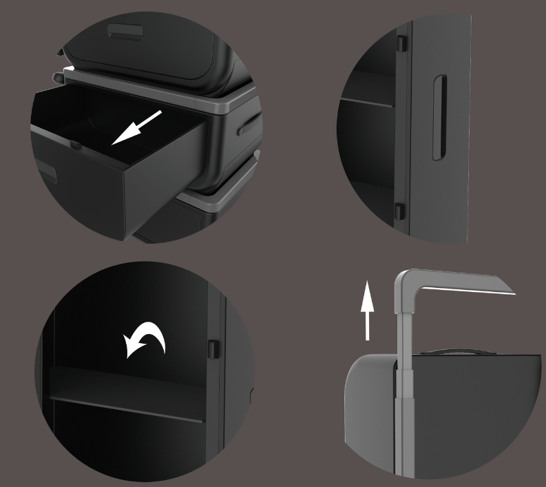 本文主要针对行李箱设计了一款可以转变为家居产品的设计,外出使用时它是一个正常的行李箱,外出使用时可以组合成衣柜或者置物架产品。外出使用时,可以将行李箱内部的置物板翻转到与底部平行后放置衣物,或者将置物板翻转到垂直状态可以当行李箱的隔板。行李箱的侧面把手连接着锁,轻拉把手即可开锁,保证了行李箱的安全性。在家使用时可将其竖直站立组合成置物架,将箱体拖出后再将置物板度90度翻转下来,即可实现置物功能。在充当置物架使用时,也可以将上方的拉杆拉起来,挂晒一些平时的衣物。除了转变为置物架,还可以将行李箱平躺在地方上,从上至下组合为衣柜,可放置平时的衣物或者当作储物抽屉。