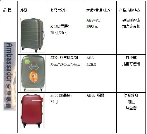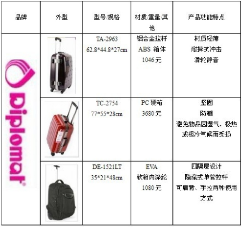 消费者除了对行李箱的外观上有很大的要求,在稳定性和安全性的问题上也有很高的要求,这就要求行李箱的制作工艺能够满足安全稳定的特点。现有行李箱的四个角一般都采用圆角设计的原因是为了让行李箱更加的稳固,也可以使行李箱在视觉效果上更加的美观。市场上不同品牌的拉杆箱有其不同的材质结构特点,我将各个品牌汇总起来,以下内容是就各个品牌的拉杆箱进行的分析。