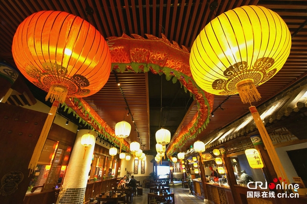 比如在餐饮空间中可以用到非常多样性的,跟中国传统文化息息相关的元素。很多宝贵的文化遗产都是祖先对于中华儿女的馈赠。[6]像上图中灯笼的装饰既可以承担餐饮空间的照明效果,又可以起到装饰作用活跃空间气氛。像图中皮影元素的加入可以跟人们之间互动,带来更多的乐趣。