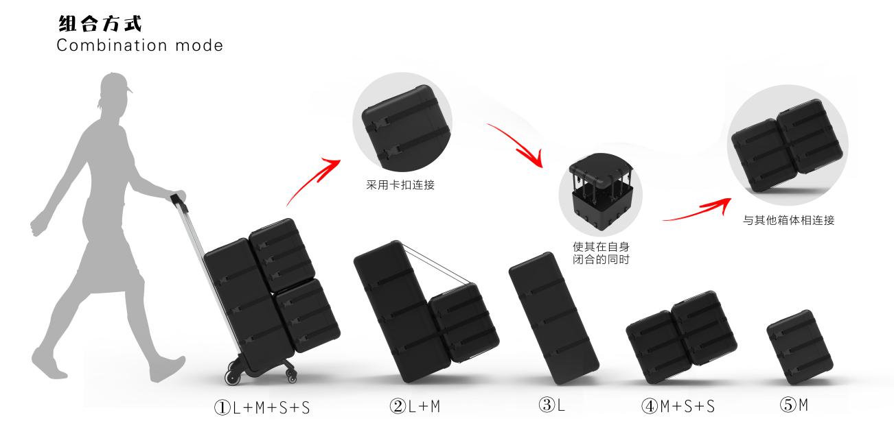 将模块化设计的方法运用到行李箱的设计中,有利于满足用户的多样化及个性化需求,降低生产和销售成本,同时满足环境可持续化发展。用户不仅是消费者,还可能是产品的创意者和设计者,将用户和产品联系在一起,有利于促进人与产品的关系。