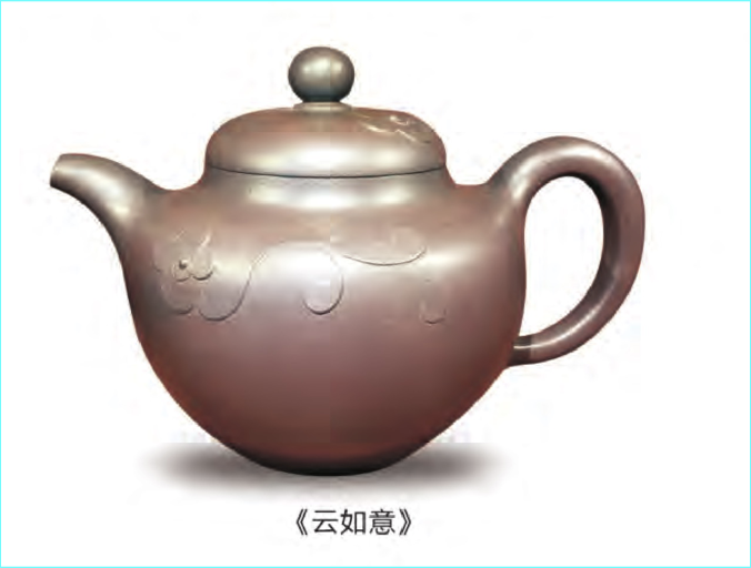 《云如意》紫砂壶是宜兴出产的紫砂壶。其壶身圆润,以简练的线条构成淳朴凝重的形体,细腻的胎质泛着深褐的色泽。壶肩雕琢的如意纹,大气美观,每一个如意纹似乎都起伏动感,跃然眼前,其姿态饱满,线条灵动流转,跟进一步地丰富着壶的情感[4]。而这壶中大量使用的如意纹样,其如意纹与壶体完美结合,造型丰富且有层次,为整个壶赋予了“望其如意”的美好祝愿。在彰显着地域特色的同时,也传承,创新,发展中塑造一个鲜活的艺术生命。