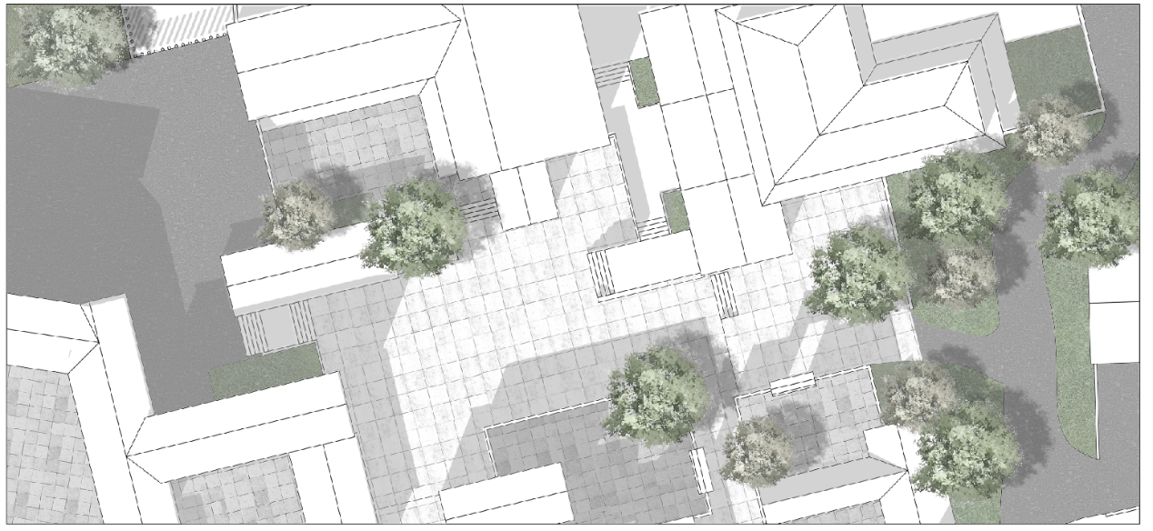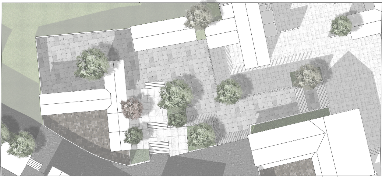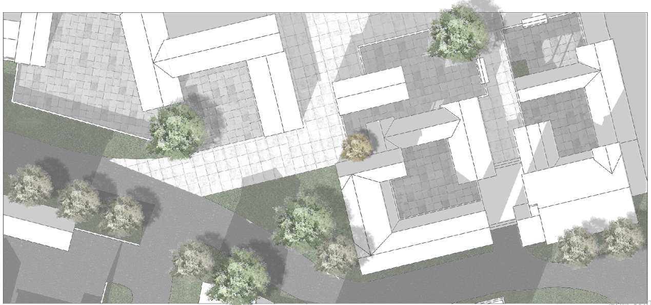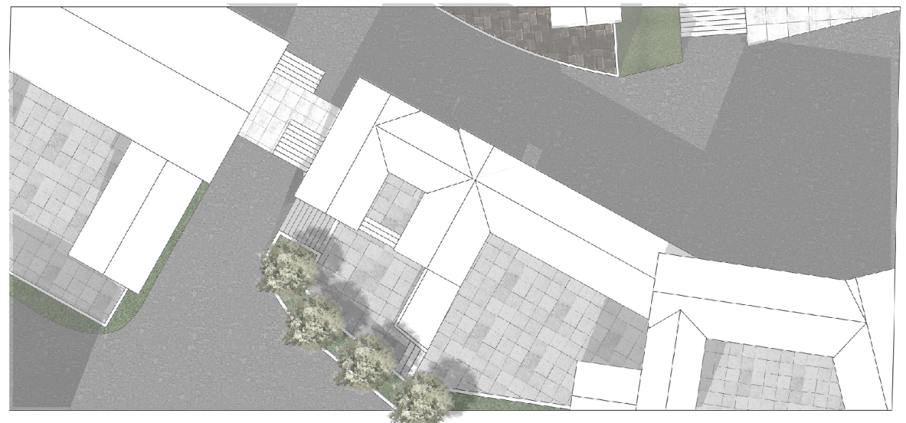 该区域是经由上图巷道进入村庄后所到达的第一处开敞空间,该区域由散布四周的5户院落围合而成,整体呈现为开敞空间,但对于村落外部,仍然保有一定的私密性,从图中可看出该区域右侧直接连接到村庄外部的次级道路上,虽然道路不宽,但为了保证村庄的围合感,将场地与外部的连接处做了先抬高再降低的处理。这种处理方式中用了台阶与坡道两种处理方式,一来丰富了场地中的游行体验,其次也考虑到了残疾人士的出行。