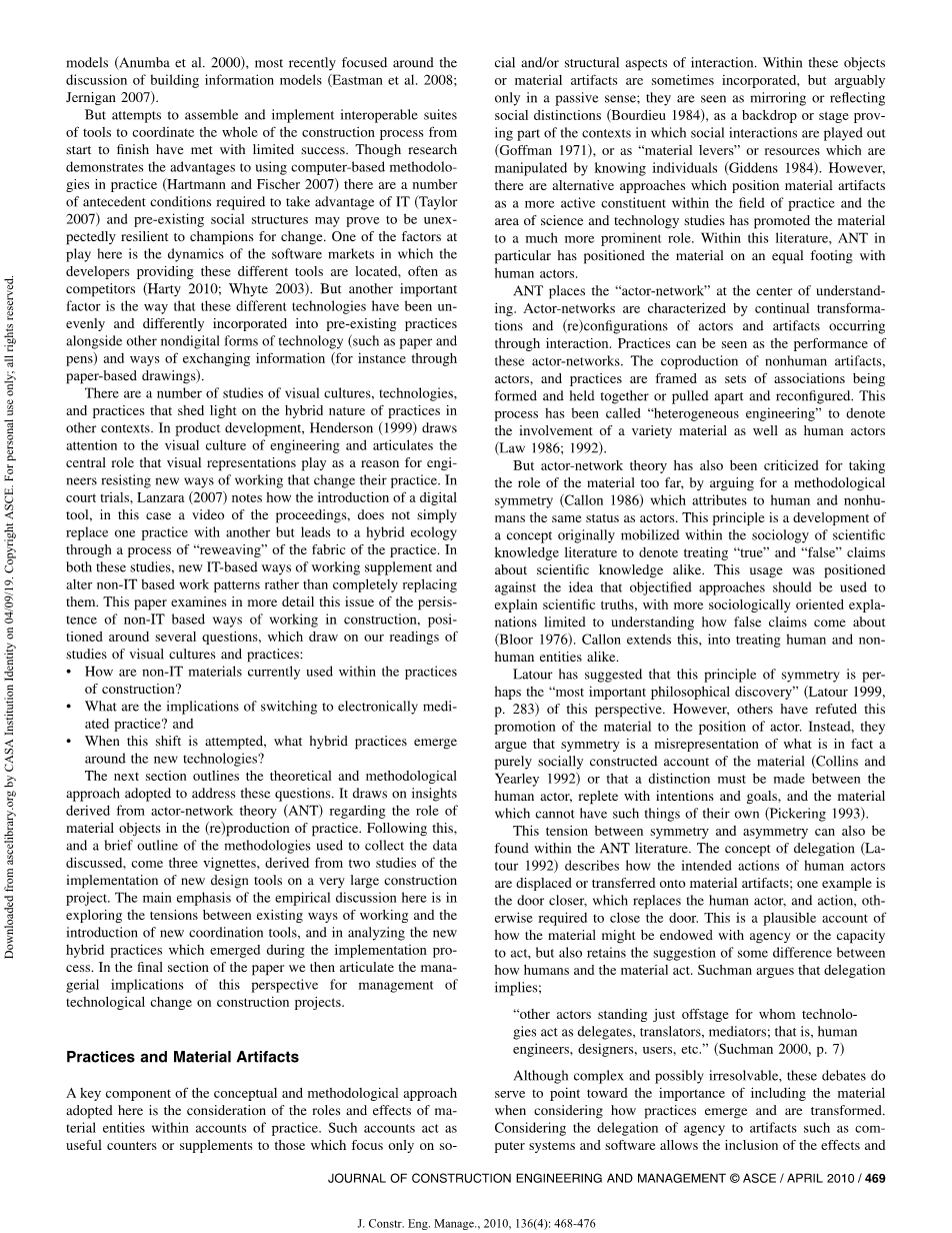 在考虑如何将新技术纳入实践时,参与者网络和委托的概念提供了有用的分析工具。追踪行动者网络的关联和结构,将研究人员引向互动的社会方面——人们互动的方式,以及为他们提供信息的期望、想法和惯例。但是行为者网络也强调而不是排除了物质工件在实践执行中的积极作用。通过将该机构定位为授权机构,可以保留人类和非人类之间的一些不对称或差异,而不淡化材料的这一作用。该方法已开始在2005年建筑业的背景下进行讨论;2008年。