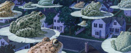水彩是水与研磨成粉末的颜料的混合物,通过和水的调和来控制它的浓度,不同颜色之间可以产生水纹似的晕染效果,水彩画到纸上呈现透明的状态因而可以显现纸的底纹,水彩可以用于刻画很细致写实的物体,具有极佳的表现力和灵活性,颜色轻盈通透,深色可以覆盖浅色,所以绘画时一般由浅至深上色,绘本艺术家艾米莉·阿诺德·麦卡利就是一改往日简洁的风格尝试运用水彩绘制了《天空在脚下》(图2.1)并获得了1993年凯迪克奖的金奖,还有大卫·威斯纳的《疯狂星期二》[[4]](图2.2)中一幕幕细腻而又超现实的场景也都是通过来水彩表现的。