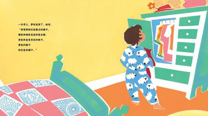 版画包括铜版画、麻胶板画、单刷版画等。马格利特·乔多斯-欧文就很擅长麻胶板画的应用,她将插画剪成几块后制成麻胶板,接着涂上墨水印图案,她的代表作品有《萨拉就要这样穿》(图2.7),此类作品还有运用单刷版画的《为什么天空那么遥远》等。