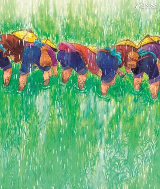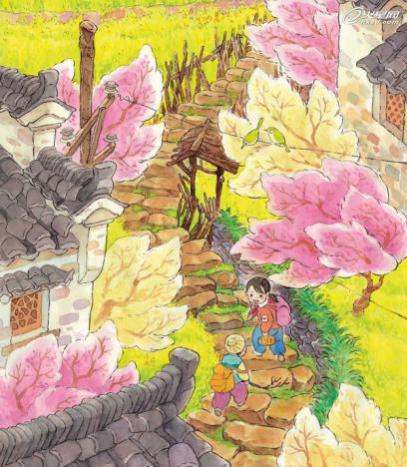 - 对分式构图(图3.6):将画面以2:1的比例分为两份,一份是主体,一份是陪衬。我的绘本第五幕使用了对分式构图,以杂草作为背景,女孩和老鼠为主体物,画面内容简洁但生动。