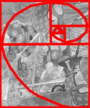 - 黄金螺旋式构图(图3.5);将画面按照黄金比例无限分割直至最终的一点落于画面的视觉中心位置,这种构图方式画面丰富生动,在曲线律动中又有远近主次关系。