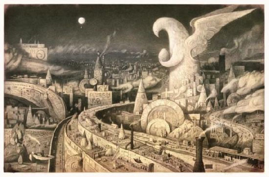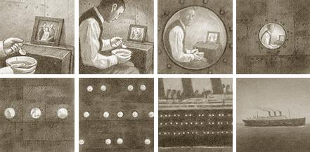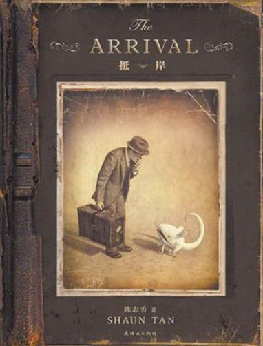《抵岸》[[8]](图3.8)是我接触到的第一本超现实主义绘本,是由澳大利亚科幻插画家陈志勇绘制的并斩获多个国家大奖,它的画面精致且写实,是一本无字绘本,虽然通篇没有一个文字,但是在这本绘本中的几百幅图画完全可以替代文字清楚描绘出一个飘流在异国他乡的男人的经历过程。《抵岸》在绘画风格和角色设计上给了我一些启示,首先《抵岸》里面的插图是用木炭笔绘制的黑白插图(图3.9),我以前接触到的绘本都是彩色的,颜色很丰富,但当我第一次看到这本黑白绘本时它的画面感让我惊艳,甚至比彩色的绘本更吸引我,它的线条律动感很强,画面的黑白灰关系清晰,也正因为它没有其他颜色的干扰,我更加注意到画面本身的人物与剧情的发展,它在颜色上做了减法但在画面的复杂程度上却毫不逊色,所以在我的绘本创作当中,我也学习《抵岸》选择了素描这一简单的表现方式来呈现我的绘本以突出剧情和画面的重要性。而且有趣的是,《抵岸》故事里背井离乡的男主人公的形象正是绘者自己,他通过镜子将自己的形象绘制成一幅幅的插画,除了故事中的主人公外,其余的人物形象也很生动,尤其是陈志勇对于小怪物们的描绘,陈志勇的画面渲染力很强尤其体现在大的场景和小的特写上,氛围营造的或温馨或恐怖,在观看其大场景时经常会有强烈的震撼感而且代入感也很强,我也在我的绘本中可以适当尝试一些我以前没用过的视角和构图形式并创造了一些有趣的人物形象,比如在我的绘本第一幕中的女人形象她的头部是由书信组成的就是参考了《抵岸》中的一个怪物形象设计的,其他几幕在绘制时,我也尽量采用较大的透视来吸引读者注意力并加强画面的纵深感和空间感以使得场景更加宏大震撼。其次是《抵岸》对于蒙太奇手法的运用(图3.10),如下图这样当一张张地图片依次排开时,就象是镜头随着剧情的发展在逐渐拉远,这样的画面在《抵岸》当中是很常见的,就像是在观看一部无声电影,它的每一帧都在引导观者走进他塑造的一个异世界,而且在排版上图片有小图和跨页大图使绘本更具有节奏感。所以在我绘制绘本时在构图上我也尽量避免平铺直叙,而是将透视角度和画面大小进行变换以使得绘本更加生动有节奏。