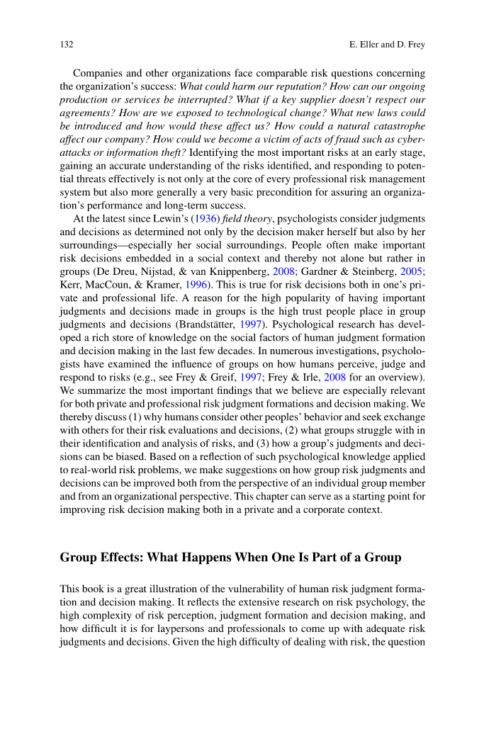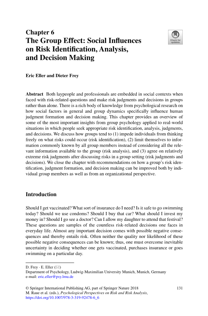 面对与风险相关的问题做出风险判断和决策时,外行和专业人士都融入了社会环境小组而不是单独。从心理学的研究中可以看出,社会因素在总体上和群体动态中是如何具体地影响人的判断的。这一章概述了一些最重要的见解从群体心理学应用于现实世界的情况下人们寻求适当的风险识别、分析、判断和决策。我们讨论群体如何(1)阻碍个人自由思考可能发生的风险(风险识别),(2)将自己限制在所有小组成员通常知道的情况下,而不是考虑所有可供小组使用的释放信息(风险分析)。和(3)在讨论了一组背景下的风险(风险判断和决策)后,就相对极端的风险判断达成一致。在这一章的结尾,我们提出了一个群体的风险一致性、判断的形成,同时,可以通过独立的团体成员和组织的角度来改进决策。