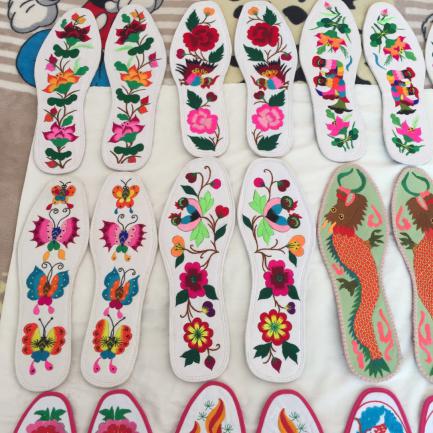 陕西关中地区对于鞋垫的制作大都使用布面材料,根据对社会环境的调查和分析可以得知在最初的阶段使用的并不会是完整的布料而是使用做衣服剩下来的边角料,而现在多是使用质量品相都相对较好的棉布进行制作。鞋垫的制作分为两步,第一步是使用面粉加水熬制浆糊给棉布进行打浆,打浆就是使用浆糊涂满布料并晒干使其变得具有韧性、不会松散。晒干后使用模板裁剪出鞋垫的形状并每三层粘起来,最后贴上底子和面子也就是鞋垫的正反面,再进行包边就完成了鞋垫胚的制作。