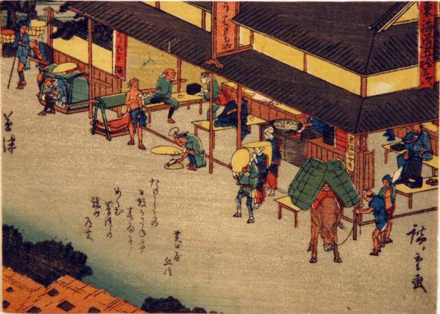 在许多浮世绘作品中,日本桥的附近总是人声鼎沸。在当时,主要是一些小贩用扁担挑着商品来回叫卖,小贩和市民们彼此来往。一开始只有一些新鲜的蔬菜和鱼肉,(图3-1-2)因为有需求,后来也开始卖一些做好的熟食。还有一种比较正规的“餐厅”叫做“料理茶屋”(图3-1-1)不过,料理茶屋并不是一个完完全全只提供饮食的地方,有点类似于中国古代的驿站,行商的小贩,做工的町人,路过这里,可以坐下来歇一歇,倒上杯清茶,来一碟小菜,再或者休息一下。主要给人提供一个暂时休息的场所。并不是让人能好好坐下来吃一顿完完整整饭的地方。