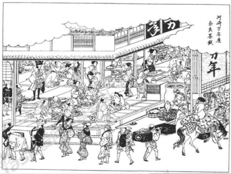 图中所画的“奈良茶饭屋”(图3-1-3),是日本第一家专门提供给庶民饮食的“餐厅”。也是日本现代餐厅的原型。图中大大小小的商贩往来不绝,主要就是为平民服务。“茶饭屋”是今天日本餐厅的前身,主要供应的,就是一整套的饭菜。“茶饭”不是单指米饭和茶水,而是一种用茶水煮出来的饭,有些店也会加上酱油和酒。到了现代,去一些传统的日式和餐厅,点餐时吃 的也是一人一套的定食,一般是一个人一份米饭和汤,再加上几盘小碟子装的配菜,有时候还会有点心之类的。全部摆在一个大的盘子里,一般是一人一盘,大家都自己吃自己的。据说巴黎在1765年才开张了第一家餐厅,伦敦则是在1828 年才出现,江湖的饮食文化可以说是十分先进了。