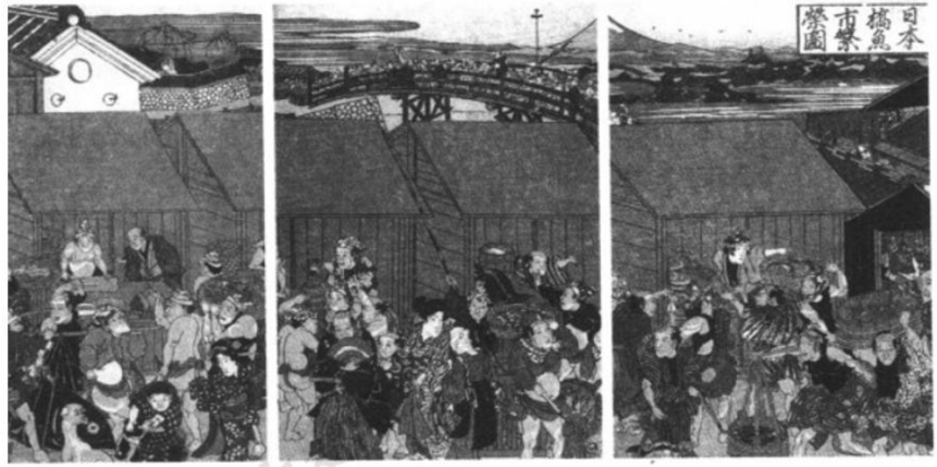 每年到了鲣鱼上市的时节,江户地区的商贩会专门开辟鲣鱼专卖市场(图3-3-1),江户人都会争先恐后的购买。