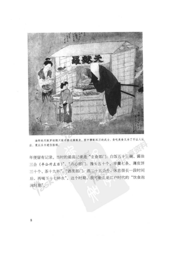 路边摊里卖得最好的是寿司和天麸罗,寿司最初是一种用来保存鱼的方式,在鱼的身上抹上食言,再用重物压制,最后让其自然发酵。在产生酸味之后,就可以食用了。今天我们难以想象味道,只听说味道非常好。天麸罗则是将新鲜的蔬菜或者鱼虾,裹上一层面粉做的糊,再将其下入油锅中炸。再配以萝卜泥或者其他酱料,非常美味。由于有了明历大火的前车之鉴,幕府为了防止再次发生这样火灾,禁止商贩在家中或者室内营业,这样一来,想要品尝天麸罗这样的美食。就只能去路边摊了。但是上流和中流阶级的人,对路边摊是不屑一顾的。所以,当时的上流社会,武士阶级和有钱的商人,在高级餐厅反而品尝不到这样的美食。一直到了幕府末期,幕府才解除禁令,料理店才出现高级天麸罗。(图3-2-3)