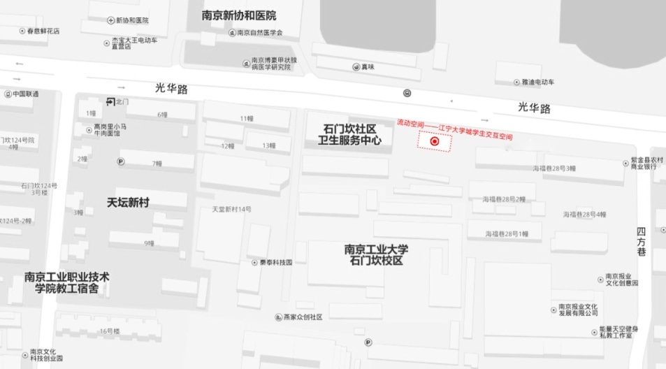 交互中心的选址位于光华路,在江宁大学城中心地带,毗邻南京工业大学石门坎校区。同时与南京文化科技创业园、南京报业文化创意园形成一个等腰三角形的关系,这样能够形成一个有文化氛围的圈子,相互依托、互动。通过对空间的利用和改造,结合新兴展示技术与材料的运用,能够给江宁大学城的大学生们提供一个更全面的交互空间。