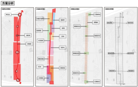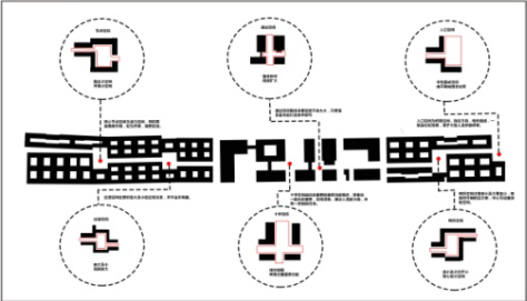 首先我们对该基地进行了功能增加与功能复合,增加了城市绿地公园,商办住混合的公寓,以及科研中心的部分功能扩展,包括展览馆,文化馆等等。在功能复合上,对于原有的现状建筑质量较差的商业街进行拆除,并且全部使用四坡加双坡的古建风格,分为一进和二进的院落形式,以此打造出一条商业气息浓厚的商业街,对于原有商业街内的闽赣会馆遗址进行了保留,并构造一定的广场来吸引人流,在闽赣会馆遗址的旁边构建了社区中心,对运河南岸进行社区管理,原有的西仓桥小学根据上位规划指导进行拆除,搬迁到运河五号的西部。西南的居住区对部分建筑进行了保留,并加建了中高层建筑和高层公寓,公寓可以具有商也功能,有办公功能,有居住功能。运河五号创意街区位于常州市三堡街,京杭大运河南岸,是常州市实施“中部提升”战略、构建“运河历史文化产业带”的重要节点。“运河五号”串联起原有老街、老巷、老厂,提炼出“创意、记忆、工艺”的内涵,围绕“运河文化、工业遗存、创意产业”的三大主题,利用原常州恒源畅厂、常州第五毛纺织厂、常州梳篦厂、常州航海仪器厂等工业遗存和文化遗迹,加以改造和利用,建设一个设施完备、功能完善、服务全面、氛围独特的吸引设计类创意人才和企业创业和发展的平台。针对这一上位规划,我们保留了运河五号几乎所有的建筑,并打通运河五号南边的围墙,构造一个属于南部居住区、运河五号和学校的公共景观绿地。运河五号东部对于仙鹤酱品厂,由于老厂区已经搬迁了绝大部分,处于空置的状况,而且建筑质量相当一般,予以拆除,并且改建为居住区,东部沿街面以高层公寓来形成一个非常高而且齐整的沿街面。